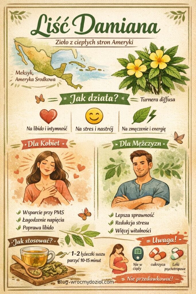 W suchych, nasłonecznionych rejonach Meksyku rośnie niepozorny krzew o drobnych liściach i delikatnych kwiatach. Dla rdzennych mieszkańców nie był „suplementem”, lecz rośliną towarzyszącą codzienności – pomagał odzyskać siły po ciężkim dniu, wyciszyć emocje i zbliżyć ludzi do siebie. Z czasem liść damiana stał się jednym z najbardziej rozpoznawalnych ziół Ameryki Środkowej, cenionym nie za spektakularne efekty „od razu”, ale za łagodne, ciepłe działanie.