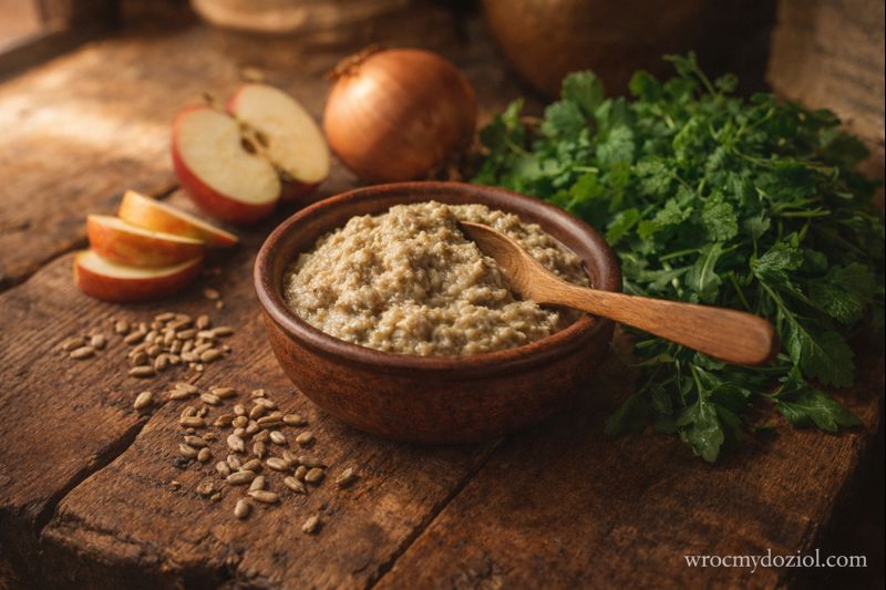 Ziarna słonecznika są bogate w naturalne tłuszcze, białko, witaminę E i minerały. W połączeniu z cebulą, jabłkiem i ziołami tworzą pastę, która jest nie tylko pożywna, ale też wyjątkowo lekka dla żołądka. Dawniej takie pasty przygotowywano zamiast wędlin – jako zdrowe smarowidło do chleba, szczególnie w dni postne.